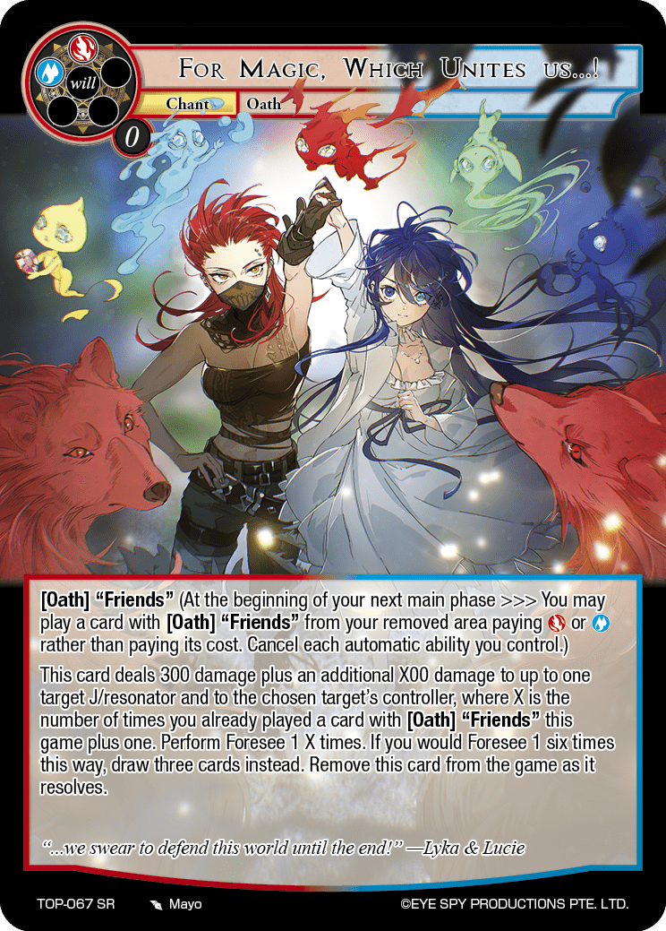 This card deals 300 damage plus an additional X00 damage to up to one target J/resonator and to the chosen target's controller, where X is the number of times you already played a card with [Oath] "Friends" this game plus one. Perform Foresee 1 X times. If you would Foresee 1 six times this way, draw three cards instead. Remove this card from the game as it resolves.