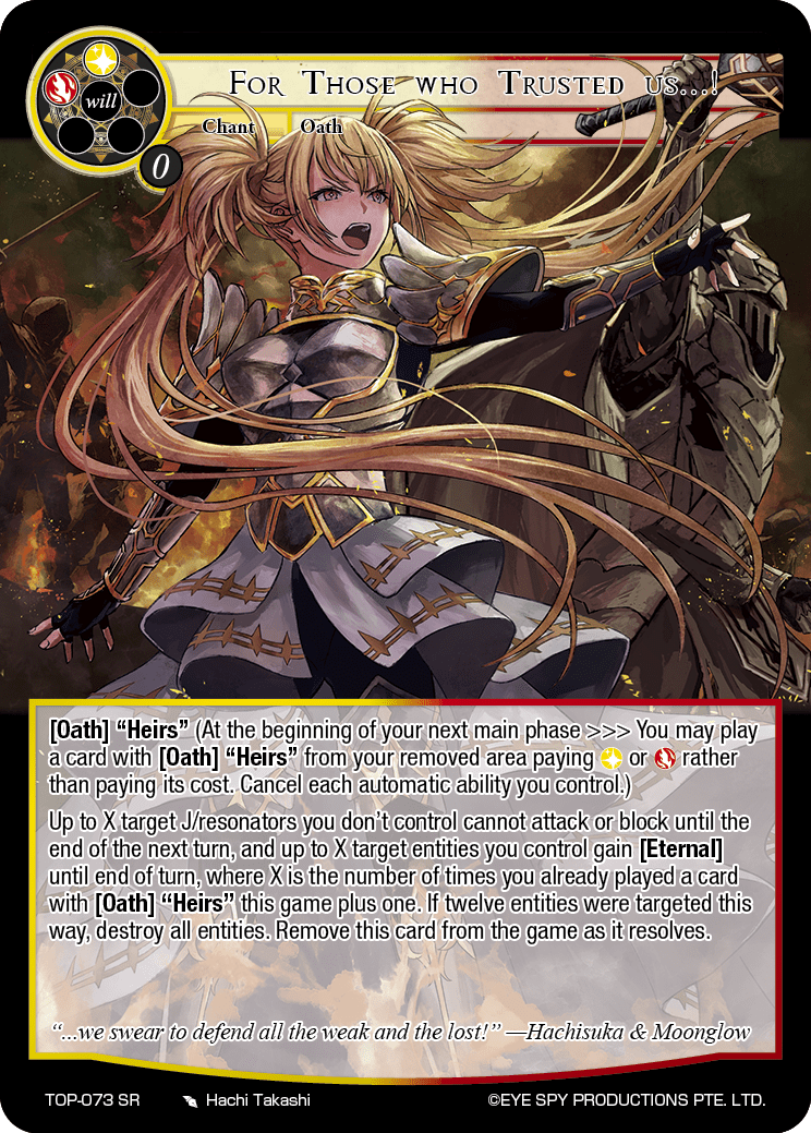 Up to X target J/resonators you don't control cannot attack or block until the end of the next turn, and up to X target entities you control gain [Eternal] until end of turn, where X is the number of times you already played a card with [Oath] "Heirs" this game plus one. If twelve entities were targeted this way, destroy all entities. Remove this card from the game as it resolves.