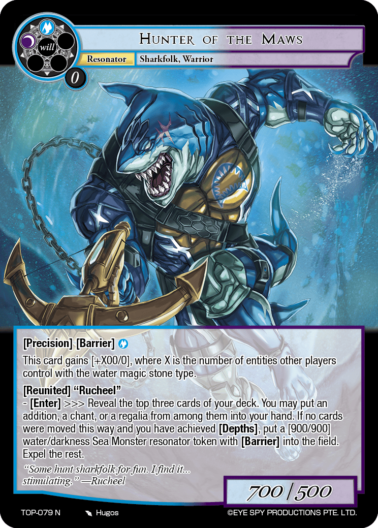 - [Enter] >>> Reveal the top three cards of your deck. You may put an addition, a chant, or a regalia from among them into your hand. If no cards were moved this way and you have achieved [Depths], put a [900/900] water/darkness Sea Monster resonator token with [Barrier] into the field. Expel the rest.