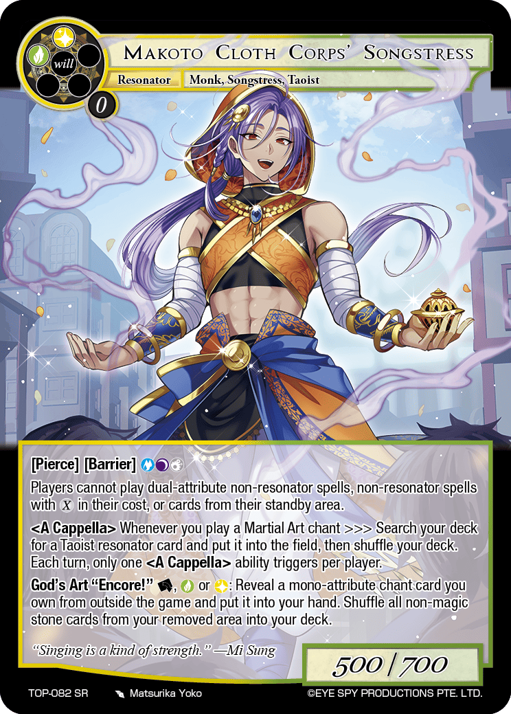 <A Cappella> Whenever you play a Martial Art chant >>> Search your deck for a Taoist resonator card and put it into the field, then shuffle your deck. Each turn, only one <A Cappella> ability triggers per player.