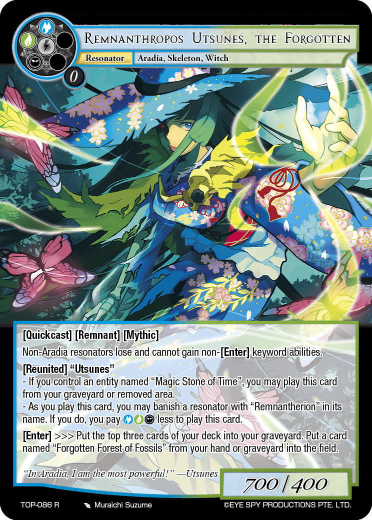 - As you play this card, you may banish a resonator with "Remnantherion" in its name. If you do, you pay [B][G][T] less to play this card.
