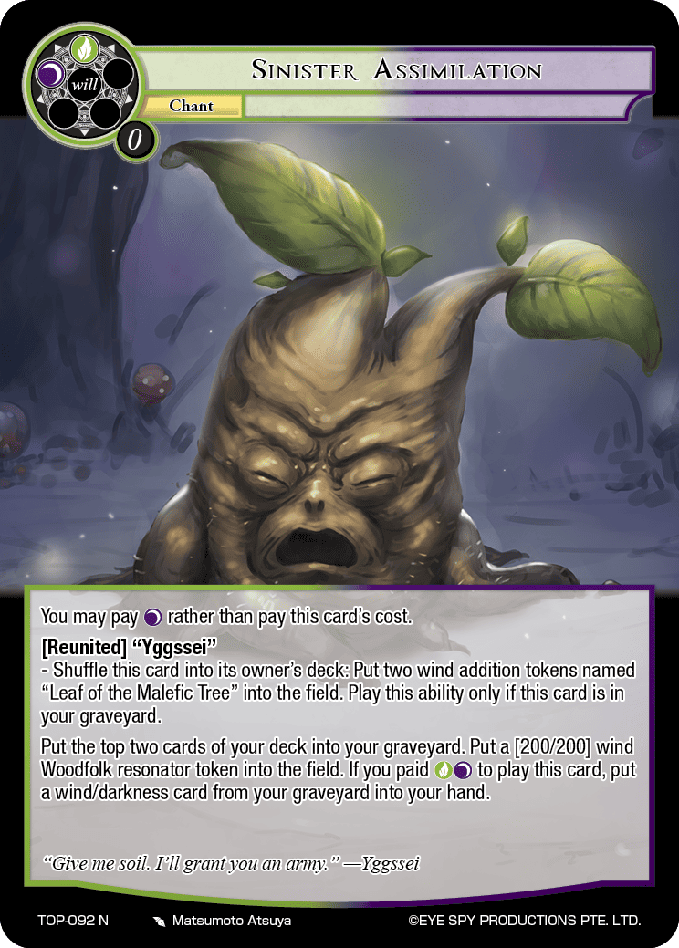 Put the top two cards of your deck into your graveyard. Put a [200/200] wind Woodfolk resonator token into the field. If you paid [G][D] to play this card, put a wind/darkness card from your graveyard into your hand.