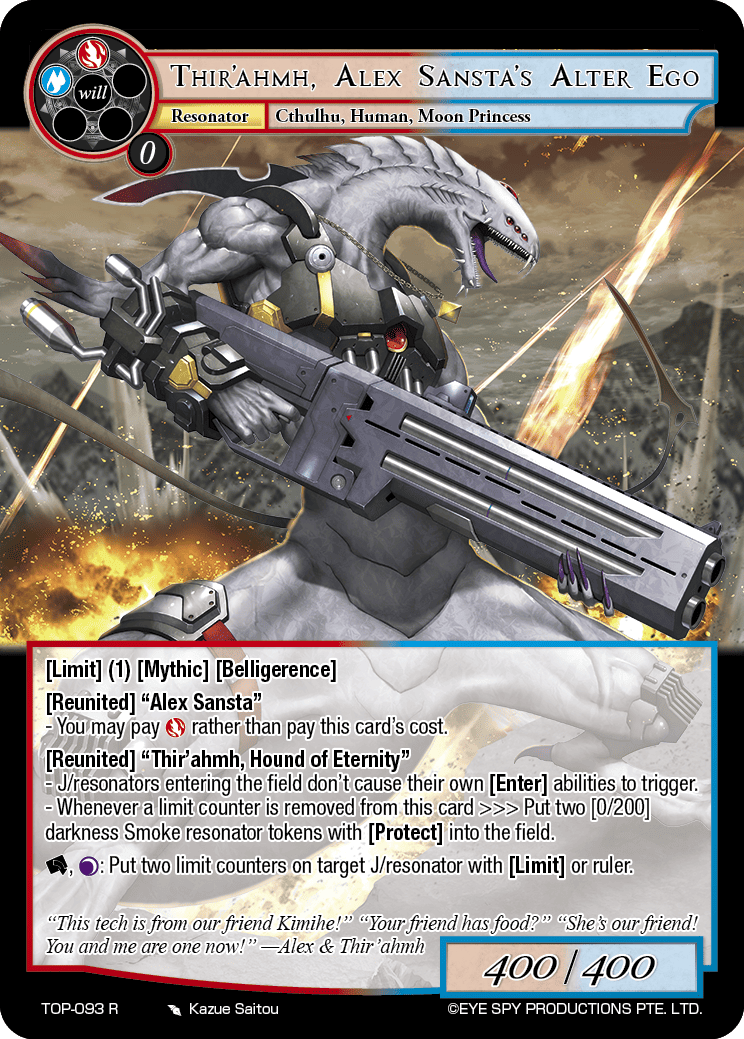 - Whenever a limit counter is removed from this card >>> Put two [0/200] darkness Smoke resonator tokens with [Protect] into the field.