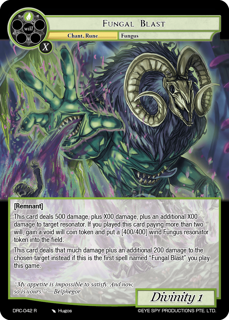 This card deals that much damage plus an additional 200 damage to the chosen target instead if this is the first spell named "Fungal Blast" you play this game.