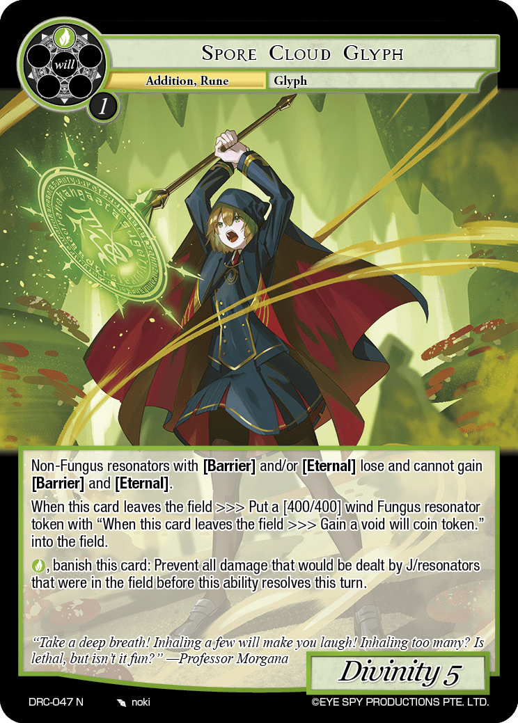 When this card leaves the field >>> Put a [400/400] wind Fungus resonator token with "When this card leaves the field >>> Gain a void will coin token." into the field.